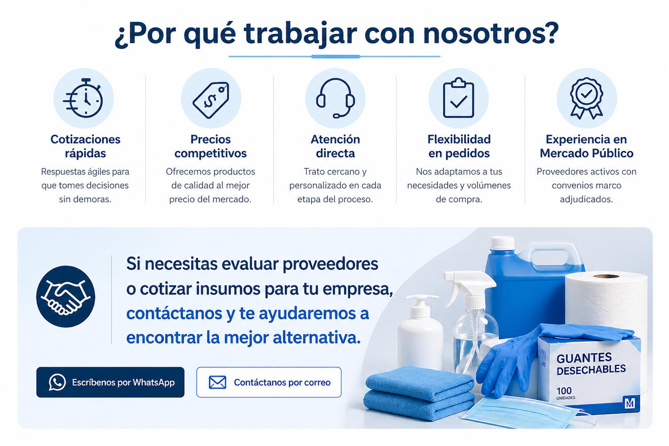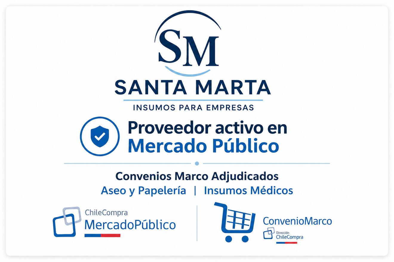 Trabajamos como proveedores en Mercado Público, contando con experiencia en procesos de compra institucional y cumplimiento de estándares exigidos por organismos públicos.Nuestra empresa cuenta con convenios marco adjudicados en las categorías de aseo y papelería, así como en insumos médicos, lo que respalda nuestra capacidad operativa y confiabilidad como proveedor.